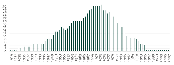 Como resultado da consolidação das infraestruturas, fundamentalmente a elétrica, a rodoviária e a de comunicação, em paralelo à um cenário nacional de desenvolvimento de um mercado de produtos de origem agropecuária processados industrialmente ao longo dos anos 1950 e com mais intensidade na década de 1960 (DELGADO, 1985), as agroindústrias passam a se estabelecer de forma mais vigorosa no Oeste Catarinense. Estas, além de demandarem um amplo contingente produtor em áreas rurais, são também condutoras de um aumento da população urbana, que se configura como a classe operária. E é neste arranjo que os cinemas passam então a se expandir com mais facilidade, como pode ser visto no gráfico a seguir (Gráfico 1). Percebe-se um crescimento mais acentuado ao longo da década de 1960, alinhado com o referido movimento de urbanização das cidades e vilas da região.