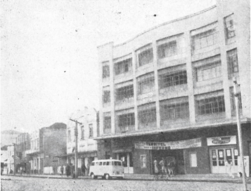 Estes espaços buscavam, quando possível, um alinhamento com as linguagens arquitetônicas de vanguarda, como o Art Déco e o Modernismo. A primeira, empregada com maior intensidade ao redor do globo nos anos iniciais do século, chega ao Oeste entre as décadas de 1950 e 1960 buscando a ideia de inovação e contraste face às edificações em madeira. Nas palavras de Maziero, Campos e Godoy (2021, p. 174) “essa arquitetura expressa o desejo do novo e não necessariamente o novo propriamente dito”, justamente por ser empregada tardiamente em relação ao restante do Estado. As pequenas cidades passam a aspirar a urbanidade de grandes centros a partir da organização espacial e das formas arquitetônicas, e este movimento de urbanização resulta em transformações também no acesso à cultura. Em 1959 o Cine Vitória é estabelecido em Joaçaba (IBGE, 1959B), em um período de crescimento econômico devido ao mercado agroindustrial. A sala possuía 1550 lugares (PEREIRA, 2013), em uma edificação de quatro pavimentos contrastante com seu entorno (Figura 7).