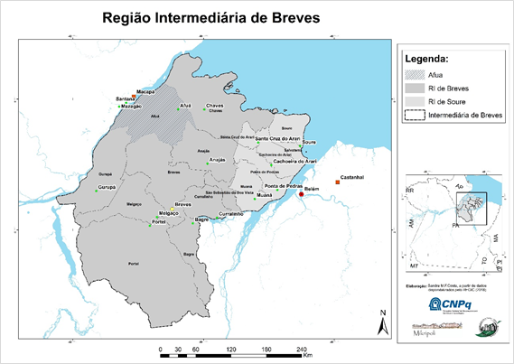 As cidades com menos de vinte mil habitantes são predominantes na Região Amazônica e correspondiam a mais de 60% do total de cidades da Região, como demonstrou o Censo de 2010. O território de estudo deste artigo, a cidade de Afuá, está localizada, na Região Intermediária de Breves, pertencente ao arquipélago do Marajó, no estuário do rio Amazonas, estado do Pará (Figura 1).