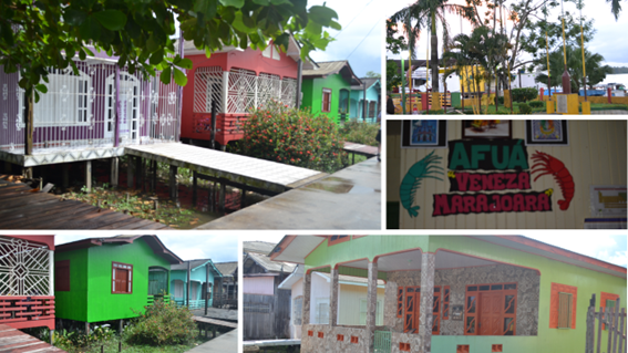 Ao se aproximar da cidade de Afuá (Figuras 2 e 3), é possível avistar com admiração sua atraente paisagem, conforme descreve Valota (2019, p. 138.) em seus estudos, devido ao colorido das casas, lembrando uma paleta de cores, apesar das semelhanças com outras cidades ribeirinhas. Ainda no encantamento paisagístico do município, Palheta e Rodrigues (2012, p. 172-173) mencionam que “a paleta de cores da cidade chama a atenção imediata do visitante” [...], além da [...] “paisagem natural composta pelo verde fechado da floresta”, rios barrentos e nuvens cinzentas.