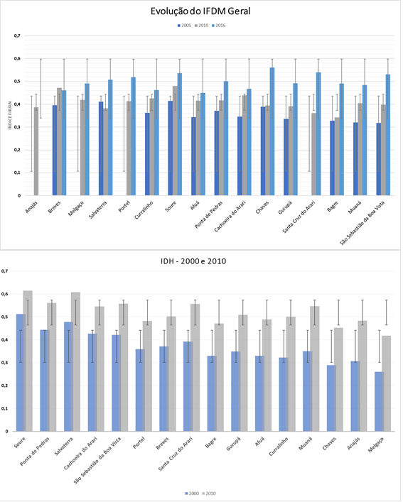 Ressalta-se que apesar dos resultados, em 2010, terem sido animadores, cabe verificar a influência das crises econômicas, pós 2010, além da crise sanitária do COVID-19, que ocorreu entre os anos de 2020 e 2022. Reforça-se, também, que os seguintes municípios obtiveram, em 2010, os piores IDHs do Pará e do Brasil: Melgaço (0,418), Afuá (0,489), Chaves (0,453), Bagre (0,471), Porto de Moz (0,503), Portel (0,483), Cachoeira do Piriá (0,473) e Anajás (0,484), sendo que, dentre estes, 6 municípios são da RegInt de Breves (Melgaço, Afuá, Chaves, Bagre, Portel e Anajás).