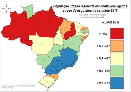 A Pesquisa Nacional de Saneamento Básico - PNSB, realizada em 2017, pelo Instituto Brasileiro de Geografia e Estatística (IBGE, 2017), revela que a região Norte possui o maior déficit nacional em termos de abastecimento de água e esgotamento sanitário, como também expõe as Unidades da Federação com menores percentuais de municípios com executoras em funcionamento de abastecimento e coleta de esgoto: são os estados da Paraíba (10%), Pará (5%), Rondônia (4,6%) e Amazonas (4,2%), ou seja, três estados da região Norte, possuem os piores indicadores. Quando essa análise se refere ao acesso ao esgotamento sanitário, a região Norte ganha ainda mais evidência diante dos baixos indicadores como demonstrado no mapa da Figura 5.