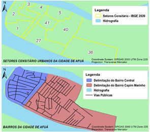 Afuá possui dois bairros (Central e Capim Marinho), que dividem sua área urbana, sendo que no bairro do Capim Marinho existem quatro comunidades, categorizadas pelo Centro de Referência de Assistência Social (CRAS), como demonstra a (Figura 6). O bairro do Capim Marinho teve sua origem, em 1980, com a instalação de palmiteiras e madeireiras na região, que atraiu trabalhadores, em busca de melhores condições de vida; sendo assim, a expansão desse bairro se deu de forma rápida e desordenada (MACEDO et al., 2018, p. 163).