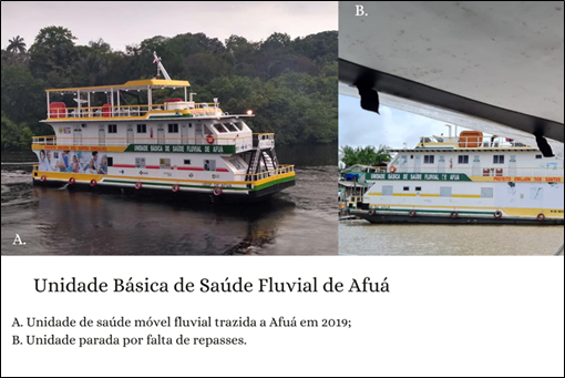 O município de Afuá possui 8.338,438 km², com 8 unidades básicas de saúde no município, 2 na área urbana, mais 13 Unidades Mistas e 12 Unidades Móveis Fluviais, totalizando 33 estabelecimentos de saúde, segundo o Ministério da Saúde (2022). Ao todo, são 25 comunidades rurais, e muitas das vezes não há um suporte em saúde, devido ao distanciamento geográfico, como um dos maiores empecilhos a esse atendimento. Uma alternativa para as comunidades ribeirinhas são as unidades fluviais de saúde[1]. No entanto, em pesquisa de campo, foi constatado que existe apenas uma única unidade móvel fluvial de saúde no município de Afuá, que estava parada, devido ao seu alto custo de manutenção (Figura 7), sendo que o custo de deslocamento varia de 80 a 90 mil reais, dependendo dos serviços oferecidos a bordo (BRASIL. MINISTÉRIO DA SAÚDE, 2023).