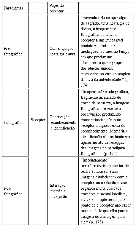 Segundo Nöth e Santaella (1998), de acordo com o processo com que foram produzidas, as imagens podem ser divididas em três paradigmas: pré-fotográfico (imagens produzidas de forma artesanal), fotográfico (imagens cuja produção depende de máquinas para viabilizar o registro) e pós-fotográfico (imagens produzidas por computador).
