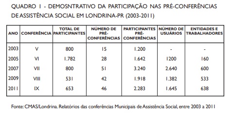 QUADRO 1 - DEMOSNTRATIVO DA PARTICIPAÇÃO NAS PRÉ-CONFERÊNCIAS DE ASSISTÊNCIA SOCIAL EM LONDRINA-PR (2003-2011)