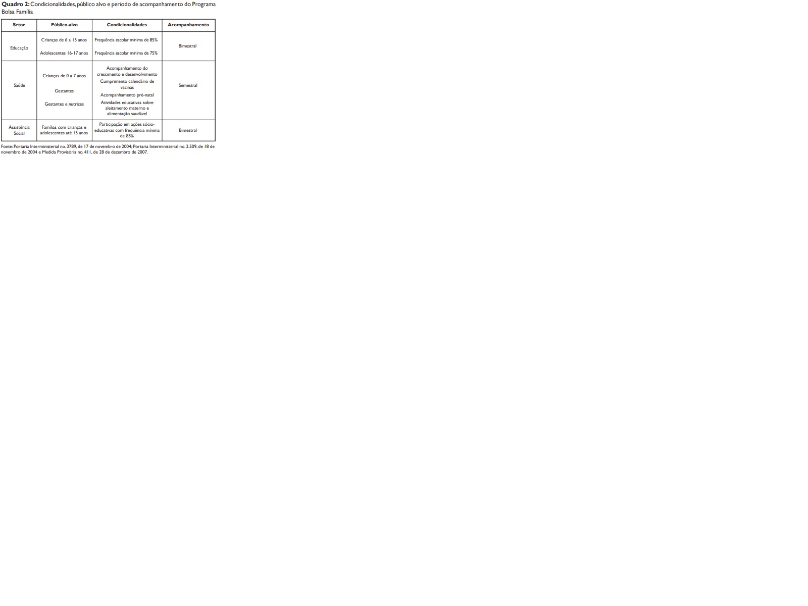 Quadro 2: Condicionalidades, público alvo e período de acompanhamento do Programa Bolsa Família