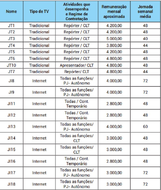 Os entrevistados das emissoras da internet que trabalham sob regime de CLT recebem em torno de R$2.800,00, e isso trabalhando mais tempo do que nas TVs tradicionais, enquanto o salário mais baixo entre os de emissoras tradicionais, que também trabalham sob esse regime, é R$3.800,00. Aqueles que têm contrato temporário com emissoras da internet têm ganhos ainda mais baixos, R$2.800,00, e sem as mesmas garantias trabalhistas que os que estão sob o regime de CLT. Os profissionais autônomos, embora apresentem remuneração um pouco maior que seus colegas de emissoras da internet, recebem menos que os jornalistas que trabalham em emissoras tradicionais e não têm direitos trabalhistas garantidos.