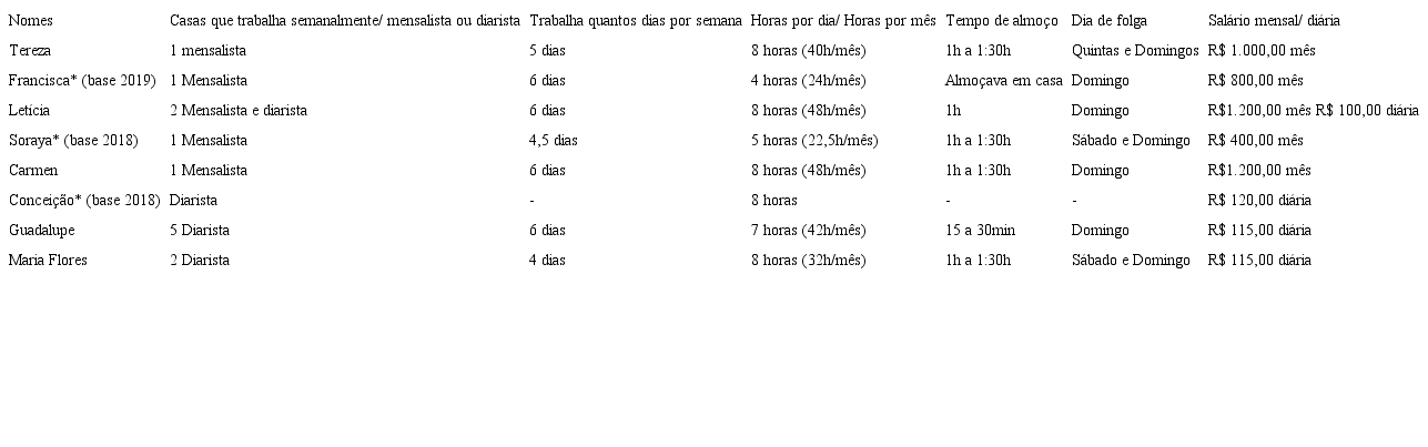 Na tabela 1, são apresentadas informações sobre os salários, carga de trabalho diário, tempo de intervalos para o almoço e dias de folgas, obtidas junto às entrevistadas.
