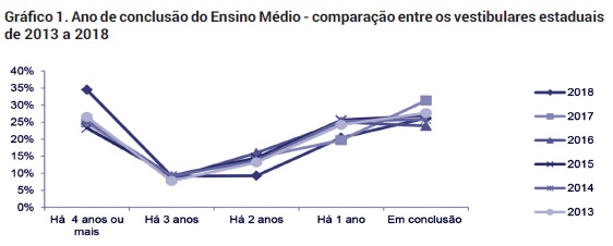Gráfico 1. Ano de conclusão do Ensino Médio - comparação entre os vestibulares estaduais de 2013 a 2018