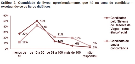 No questionário é indagado ao candidato a quantidade média de livros não didáticos lido por ele no período de 1 ano. O resultado não apresenta disparidades entre os candidatos por cota étnico-racial e de ampla concorrência. Entre aqueles, 43% informam ter lido menos que 5 livros, 40% leram entre 5 e 10 livros. E, entre os candidatos da ampla concorrência 44% informam ter lido menos que 5 livros, 37% leram entre 5 e 10 livros. Porém, quando a questão toca no elemento acesso, esses dados apresentam variações importantes conforme apontado no gráfico 2, onde 40% dos candidatos de ampla concorrência informam possuir mais de 51 unidades de livros em sua residência e de outro lado 77% dos candidatos por cota étnico racial afirmam possuir até 50 livros.