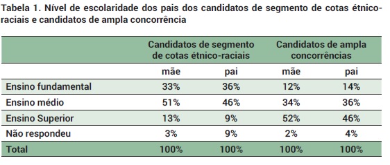 Tabela 1. Nível de escolaridade dos pais dos candidatos de segmento de cotas étnico-raciais e candidatos de ampla concorrência