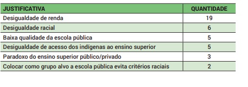 Quanto as justificativas para escolha dos grupos-alvos, percebemos que foram acionados seis argumentos: desigualdade de renda, desigualdade de raça, paradoxo do ensino superior público/privado, baixa qualidade da escola pública, desigualdade de acesso dos indígenas ao ensino superior e colocar como grupo alvo a escola pública evita critérios raciais. A tabela a seguir mostra a quantidade de vezes que esses fundamentos foram acionados.