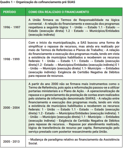 No que diz respeito diretamente ao financiamento das ações da assistência social, ela é anterior à LOAS, seu financiamento teve início, no caso brasileiro, em 1942 com a criação da Legião Brasileira de Assistência (LBA). No quadro abaixo é sistematizado como era o financiamento da assistência social antes da instituição do SUAS.