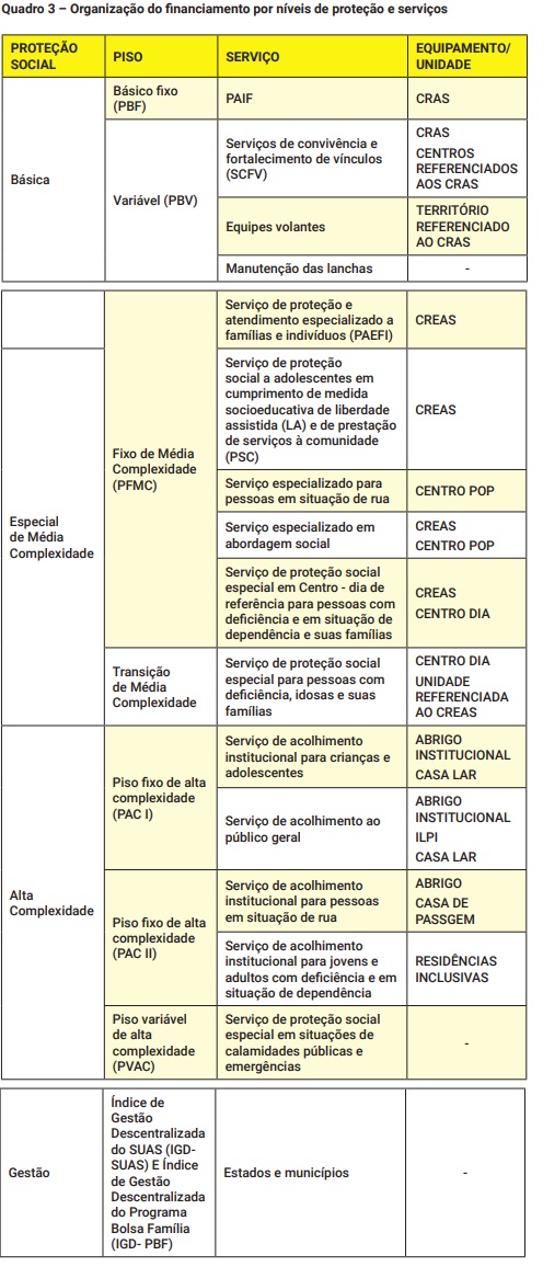 Quadro 3 – Organização do financiamento por níveis de proteção e serviços