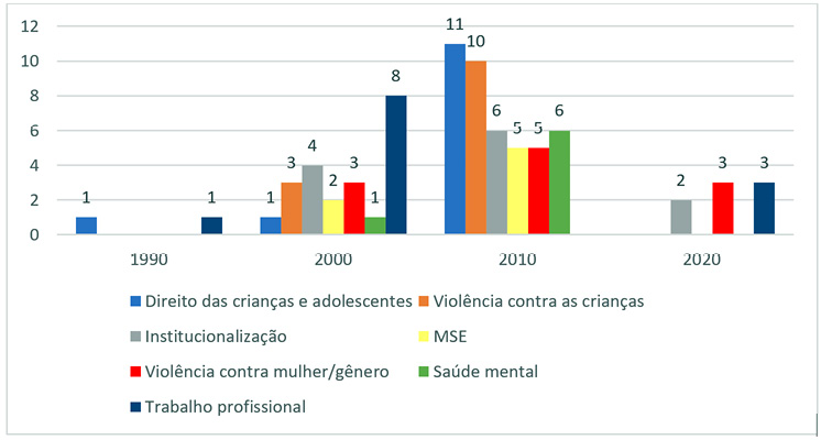 No Gráfico 1 visualizamos como estão distribuídos os temas de pesquisa, produzidos ao longo dos anos, desde 1997, por décadas, até os dias atuais. Verifica-se uma concentração importante nos temas relacionados à infância e adolescência, violência de gênero e violência contra as mulheres, e o trabalho de assistentes sociais em políticas sociais. Esses são temas amplos, que abarcam processos de trabalho, elaboração e implementação de políticas sociais, relações de cuidado nas intituições públicas e nas relações familiares, bem como processos de institucionalização de grupos em situações de maiores vulnerabilidades, entre outros.
