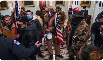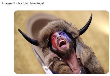 Dentre os “invasores” do Capitólio estavam militantes da supremacia branca, como Jake Angeli, cujo nome é Jacob Angeli Chansley, membro do QAnon (grupo conspiratório da extrema direita nos Estados Unidos). Conhecido por estar com o rosto pintado com a bandeira dos Estados Unidos e vestindo um chapéu de pele com chifres, Chansley estampou os jornais pelo mundo afora, inclusive a imprensa brasileira. Diversos canais da mídia o apelidaram de “extremista Viking”13.