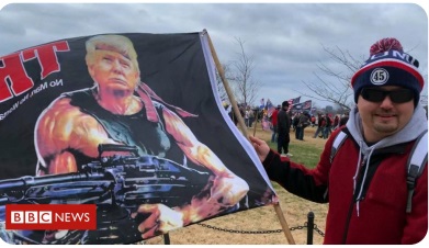 Imagem 2 – Na foto: manifestante carrega uma bandeira de Trump caracterizado como Rambo