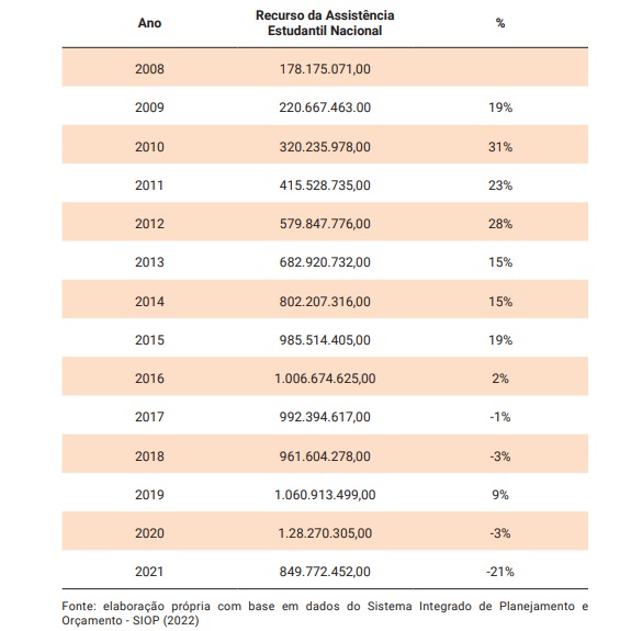 A assistência estudantil como parte integrante do ensino superior não vivencia uma realidade diferente. A tabela 01 já evidencia a asfixia no orçamento do PNAES. No entanto, na gestão Bolsonaro a situação se agrava. A PLOA de 2020 e 2021 previa para rubrica da assistência estudantil um dos menores orçamento da década. Em 2020, a proposta da lei orçamentaria era de 65% a menos do projeto de 2019. Já em 2021, a PLOA para ação assistência estudantil trazia uma redução 73% em relação a PLOA de 20205 (SIOP, 2022).
