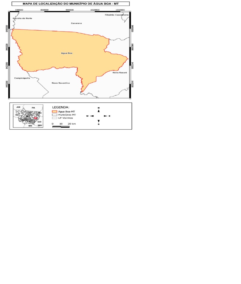 O estudo foi realizado no assentamento Jaraguá, situado sob as coordenadas geográfica 14° 00’46’’ S e 52° 31’ 23’’ O, próximo da cidade de Água Boa, com aproximadamente 21 mil hectares. Esse assentamento foi fundado em 1998 com demarcação de 420 lotes e com a média de 45 hectares (ANA, 2018).