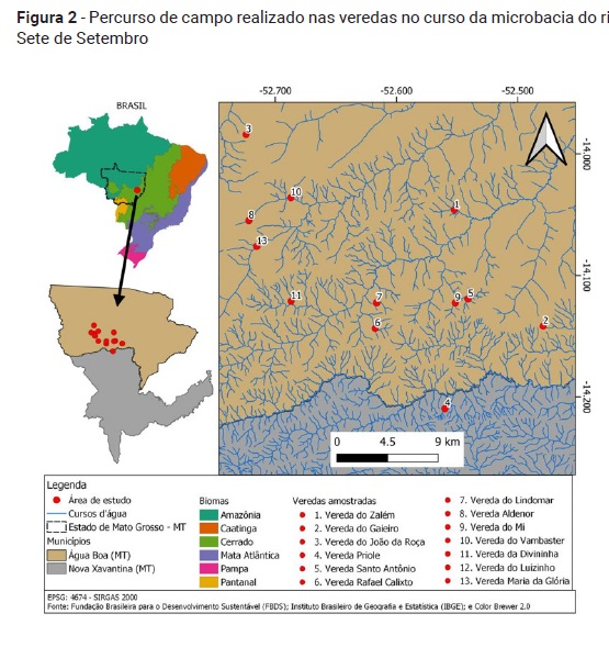 No perímetro do assentamento foram avaliados ambientes de veredas utilizando-se como critérios de seleção aqueles ambientes que são margeados pelo rio Sete de Setembro e que estão interligados à córregos maiores que desaguam no rio em questão (Figura. 2).