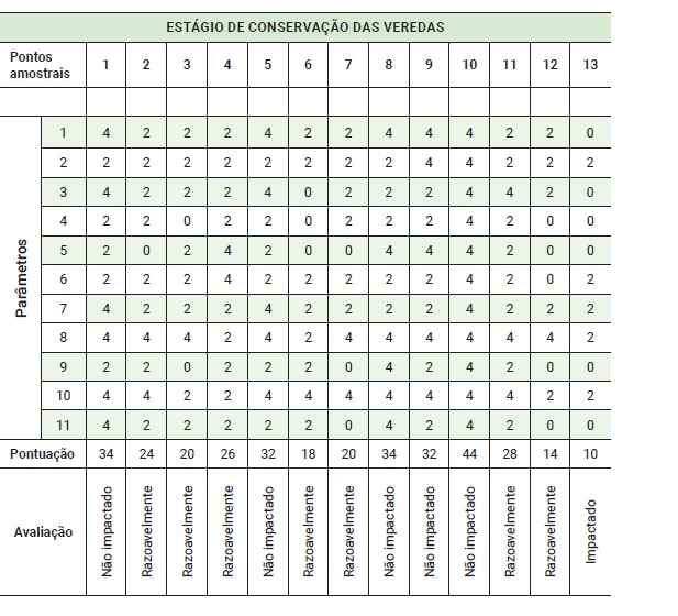 O ambiente de veredas que apresenta a somatória referente aos 11 parâmetros acima de 31 pontos é considerado como “não impactado”, o que apresenta somatória entre 11 e 30 pontos é considerado “razoavelmente impactado” e aquele que apresenta somatória entre 0 e 10 pontos é considerado “impactado”, conforme Tabela 1.