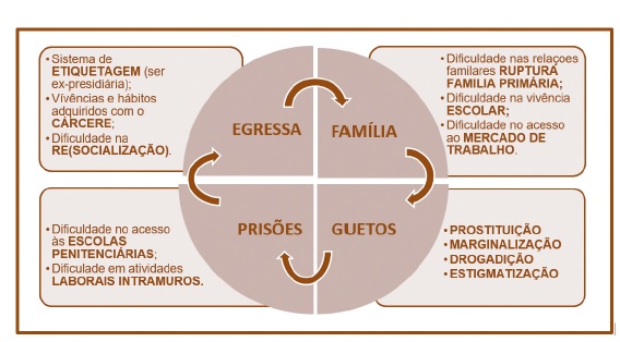 O reingresso no sistema penitenciário em nosso país é um fenômeno social atravessado por questões de raça e classe, que se reflete na maciça presença de negros e pobres no interior de nossos cárceres (SOARES e BUENO, 2016). Ademais, são essas pessoas que, quando na situação de egressas do sistema penitenciário, recebem um rótulo estigmatizante de difícil reversão ou apagamento, quando comparado com egressos brancos e ricos, conforme descrito pela teoria do etiquetamento (PENTEADO FILHO, 2012, pp. 92-94).