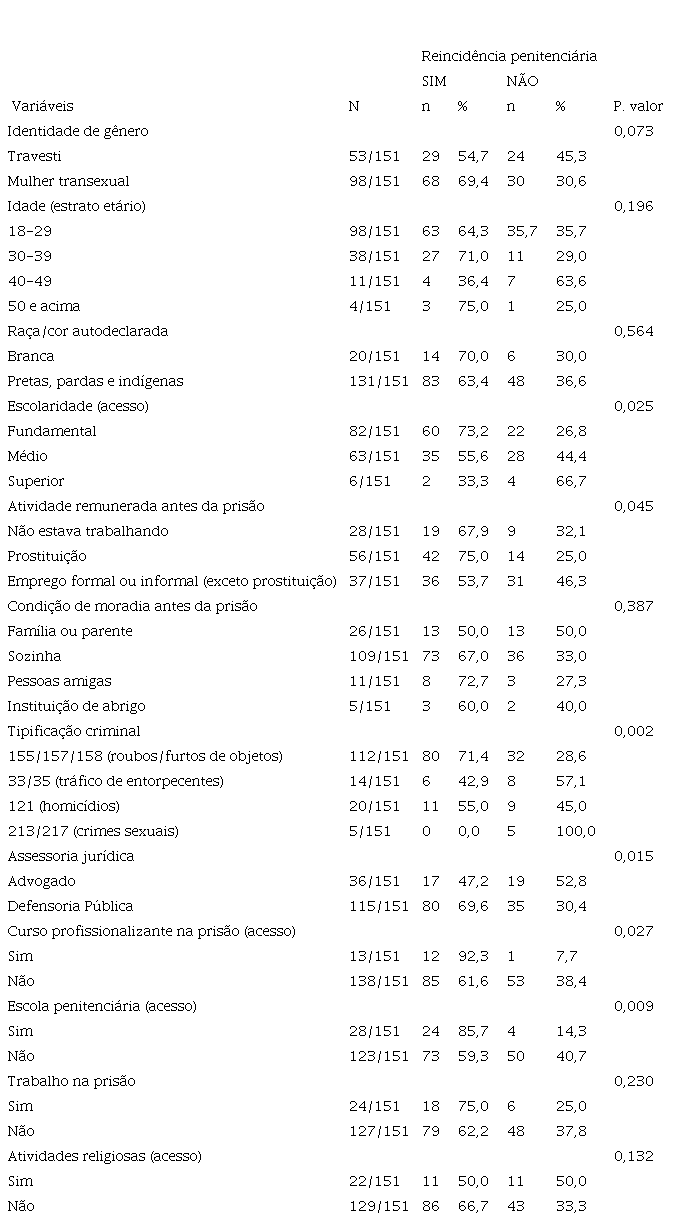 Resumo: O estudo teve como objetivo analisar a reincidência penitenciária entre as travestis e mulheres transexuais privadas de liberdade na região metropolitana do Estado do Rio de Janeiro. Trata-se de uma pesquisa quantitativa, descritiva e transversal na forma censitária envolvendo 151 entrevistadas, entre abril e junho de 2021, para descrever o perfil sociodemográfico e prisional. O teste qui-quadrado com p<0,05 revelou que a escolarização foi um fator de proteção contra a reincidência (p=0,025). Entretanto, as que se prostituíam antes da prisão (p=0,045), e as que cometeram crimes de roubos (p=0,002) reincidiram com maior frequência. Resultados que reforçam o paradigma necropolítico trans em nossa sociedade.