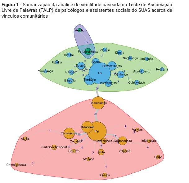 Figura 1 - Sumarização da análise de similitude baseada no Teste de Associação Livre de Palavras (TALP) de psicólogos e assistentes sociais do SUAS acerca de vínculos comunitários