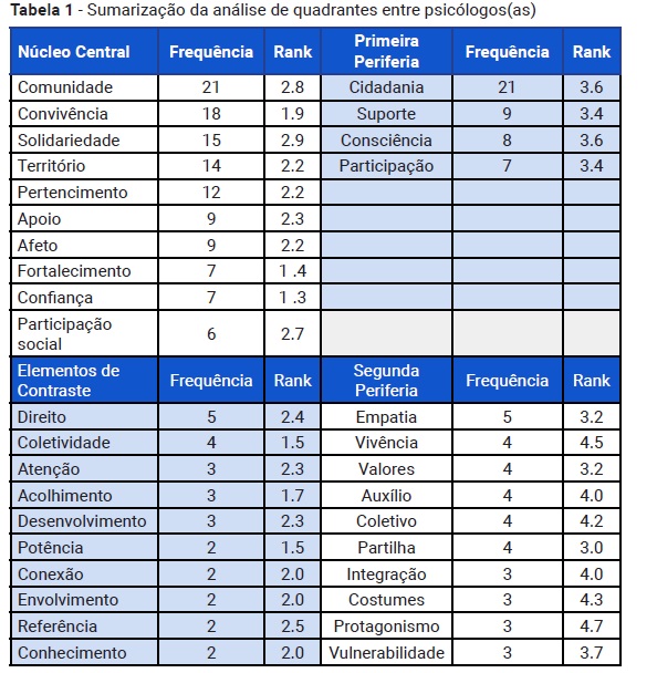 Conforme é possível observar na Tabela 1, no quadrante do Núcleo Central, encontram–se os termos de maior frequência na evocação de psicólogos, sendo também estes termos os de maior preferência na ordem de evocação, ou seja, o que os participantes escreveram primeiro. O termo mais evocado entre os psicólogos foi comunidade, sendo a concepção análoga à já apresentada na análise de similitude. Uma demonstração complementar pode ser evidenciada na descrição de outros dois participantes psicólogos que justificaram a preferência do termo comunidade para caracterizar vínculo comunitário, aproximando dos termos mais utilizados pelos assistentes sociais: “São os laços de solidariedade que se desenvolvem nos territórios e que possibilitam a construção de uma identidade coletiva e valores partilhados”.