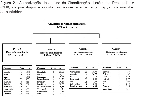 Figura 2 - Sumarização da análise da Classificação Hierárquica Descendente (CHD) de psicólogos e assistentes sociais acerca da concepção de vínculos comunitários