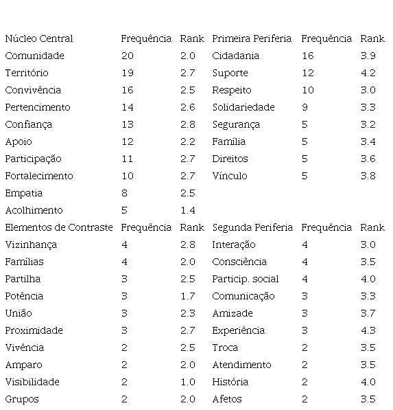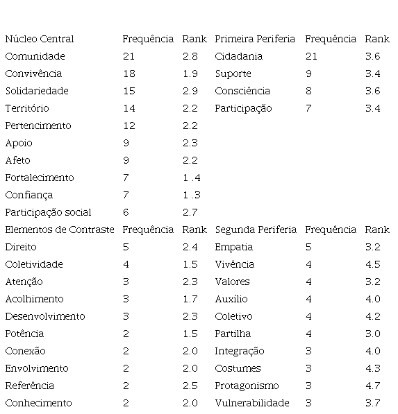 Conforme é possível observar na Tabela 2, o Núcleo Central da representação dos assistentes sociais indica significativa equivalência das categorias mais evocadas e com maiores rankings em comparação a dos psicólogos (correspondência entre comunidade, território e convivência, porém, em ordens diferentes). Destaca-se a diferença em relação a evocação do termo pertencimento, identificado apenas uma vez em primeira evocação e outras nove vezes em segunda evocação.