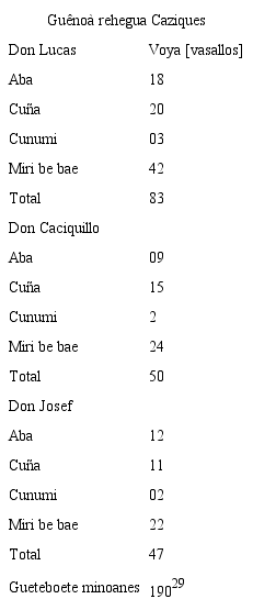 En 1801, tras el combate del primer gajo del Tacuarembó el capitán Pacheco ordenó quemar 36 toldos. En la ocasión capturó 52 “infieles” pero, sin perjuicio de su triunfalismo, no es posible establecer cuántos murieron en combate o consiguieron escapar.27 Poco antes, en el contexto de una misión de paz que acabó en hostilidad desde “un lado del arroyo Quarey (...) subido a un árbol, divisé como a distancia de diez cuadras, una pequeña toldería compuesta de dieciséis toldos (que según cuenta de las personas que suelen llenar el güeco de estos toldos, serían el número de setenta, más que menos". 28 No es claro si se está refiriendo a población total o a hombres de armas. Que la toldería fuera pequeña induce a creer lo primero. La capacidad de resistencia que demostraron sugiere lo segundo. Si así se asume, la cifra de personas por toldo podría acercarse a la que se ha visto en los casos precedentes. Por ello cabe conjeturar que en cada “estera” o “toldo” cohabitaban una decena o más de personas bajo parámetros de los que casi no han quedado indicios. Asimismo cabe suponer que una “toldería” media -y por lo tanto una parcialidad- constaba de unos treinta “toldos”. En una relación de fin del siglo XVIII referida a la presencia de guenoa minuanos en San Borja los caciques parecen tener poder sobre un número más limitado de “vasallos”; no obstante en aquel tiempo y lugar debía haber grandes distorsiones en la organización social: