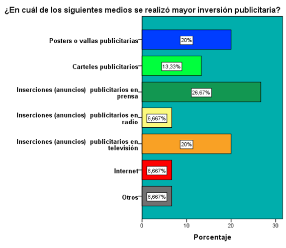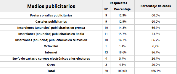 Con relación a los medios publicitarios que se utilizaron en la campaña, a nivel de frecuencias quedó demostrado que el más común utilizado por los aspirantes de ultramar, fue la publicidad por internet, ya que de los 15 encuestados, 13 coincidieron en utilizar este formato. Aunque la mayoría de los candidatos (26, 7%) destinaron una mayor inversión publicitaria a los anuncios en prensa como tradicionalmente se ha hecho.