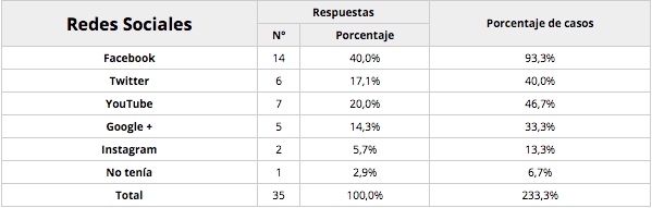 Los resultados arrojaron que de los 15 candidatos, 14 tenían cuentas en algunas de las redes sociales, es decir, el 93,3% de los encuestados, excepto un candidato que resultó electo, y afirmó que no tenía encargado de Comunicación.