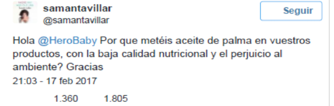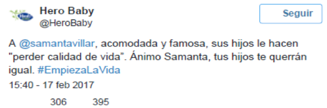 El diario Público informaba, en efecto, el 20 de febrero que «La marca de confituras Hero se ‘pega un tiro en el pie’ al atacar a la periodista Samanta Villar». Noticias parecidas pudieron ser leídas u oídas ese mismo día en otros diarios y medios de comunicación: La Vanguardia, Europapress, Cadena Ser... Todos ellos informaban de que la empresa murciana Hero Baby, el mismo día en que lanzaba la campaña #EmpiezaLaVida, en la que hablaba de la aventura de tener hijos («Cuando tienes un hijo no acaba lo bueno, empieza la aventura más grande»), había cometido el error de publicar un tuit en el que, criticando abiertamente el libro de Samanta Villar Madre hay más que una (2017), señalaba: «A @samantavillar, acomodada y famosa, sus hijos le hacen ‘perder calidad de vida’. Ánimo Samanta, tus hijos te querrán igual». El error estaba en que los internautas interpretaron que se trataba de una pugna desigual entre una multinacional y una escritora (una versión 2.0 de la pugna entre Goliat y David) y se posicionaron, abierta y mayoritariamente, a favor de la periodista. Máxime cuando la denuncia que ella hacía no fue desmentida por la marca1.