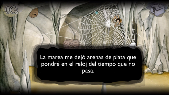 En relación con lo anterior, es importante saber que la paciencia es algo clave en el juego. Desde el principio, el camino que hay que tomar resulta bastante confuso. Esto se debe a que en el juego lo que debemos interpretar no son diálogos, sino símbolos. Para descubrir los pasos a seguir, hay que ir descifrando pictogramas. En diferentes puntos clave del juego aparecen frases de canciones de Vetusta Morla que establecen una conexión intertextual con el resto de las canciones y narrativas de la banda y que refuerzan la metanarrativa de Alice y la banda. En la figura 1 observamos versos de la canción “La Marea”, de su álbum debut Un día en el mundo. Por tanto, aquí se produce más bien una expansión narrativa de Vestusta Morla, puesto que la narrativa de las canciones se introduce en el videojuego. Observamos más ejemplos de estas características durante el juego.