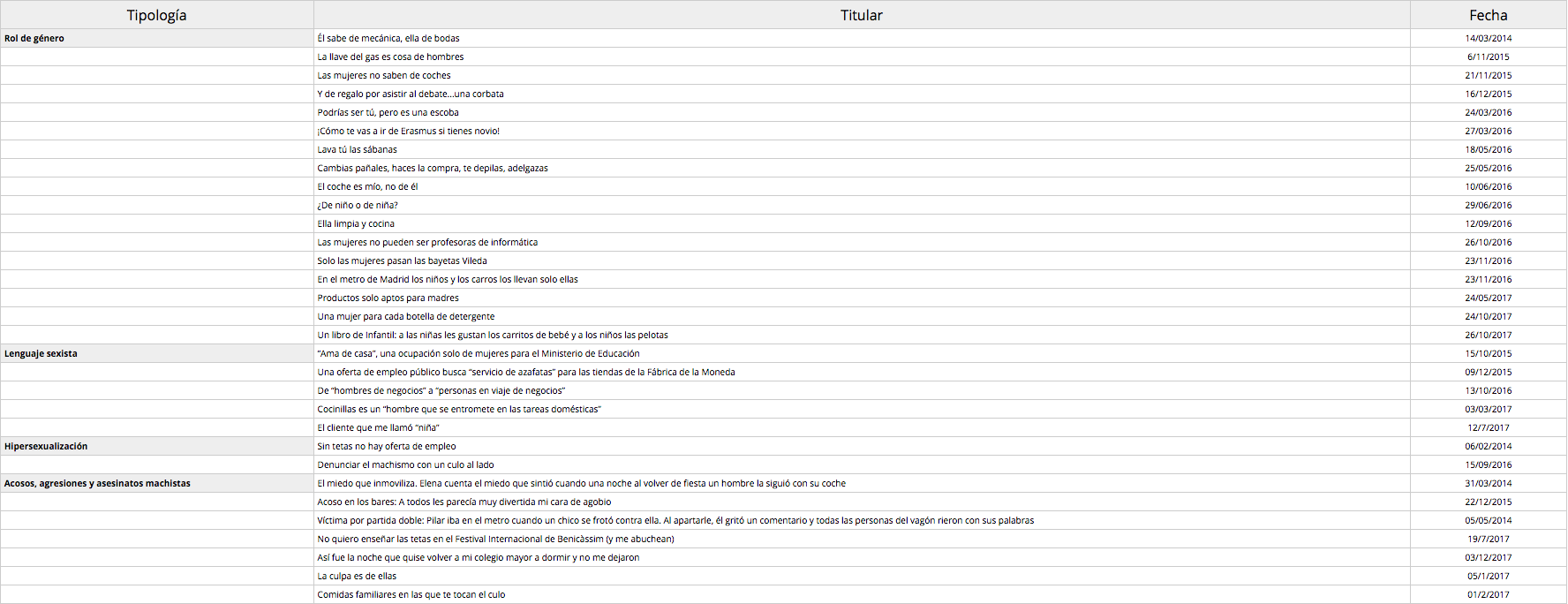En la metodología adoptada, sin embargo, se ha de tener en cuenta algunas limitaciones metodológicas, ya que no siempre ha sido posible establecer un criterio infalible a la hora de introducir un post en una categoría u otra. Ello se debe a dos aspectos fundamentalmente. En primer lugar, porque hay titulares (y con ellos el contenido completo del post) donde confluyen diferentes tipos de micromachismos y/o acosos de carácter sexual. Un titular de este tipo da muestra de ello: “Un médico en urgencias: ‘este coñito está perfectamente’” (19/12/2017). Dice el subtitular: “Marina fue a urgencias ginecológicas con un dolor muy fuerte: ‘Me quedé congelada de miedo y asco en esa camilla, piernas abiertas, semidesnuda, delante de aquel desconocido sin guantes que me miraba con lascivia y sorna’”. Este ejemplo pone de manifiesto un caso de acoso y agresión sexual con un componente de lenguaje sexista, además de un abuso del espacio público. No obstante, el criterio ha sido el de utilizar la categoría predominante, tras la lectura completa del post, en este caso el del componente de acoso sexual. En segundo lugar, hay ejemplos, sobre todo en el caso de los vídeos de campañas de denuncia, como #Amítambién, que cuentan con el testimonio de numerosas mujeres, por lo que en él confluyen experiencias diversas. No obstante, en este caso, cada uno de los relatos personales ha podido ser individualizado porque también el blog hace entregas individuales de cada uno de los videos, junto al video general.