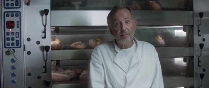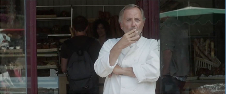 Enquanto é difundido este excerto de emissão radiofónica, vêem-se em grande plano sempre em tonalidades claro-escuro, as primeiras imagens da incorporação dos ingredientes, inicialmente a preto e branco: a farinha lançada para um recipiente com a inserção dos nomes dos atores, Gemma Arterton e Fabrice Luchini, incrustados em letras cursivas a branco. Ouve-se em voz off, o timbre inconfundível do popular ator francês Fabrice Luchini:24 «Joubert, c’est moi».
