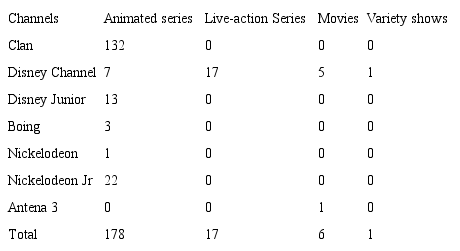 Clan TV is a children’s channel owned by the public television corporation RTVE. 50% of its programming is designed for children 3 to 6 years old, while the other 50% targets children over 7 years of age. It broadcasts 24 hours a day, seven days a week. Its schedule includes more than 30 different productions, of which 63.33% are animated series and 20% are live-action series (Melgarejo and Rodríguez, 2011).