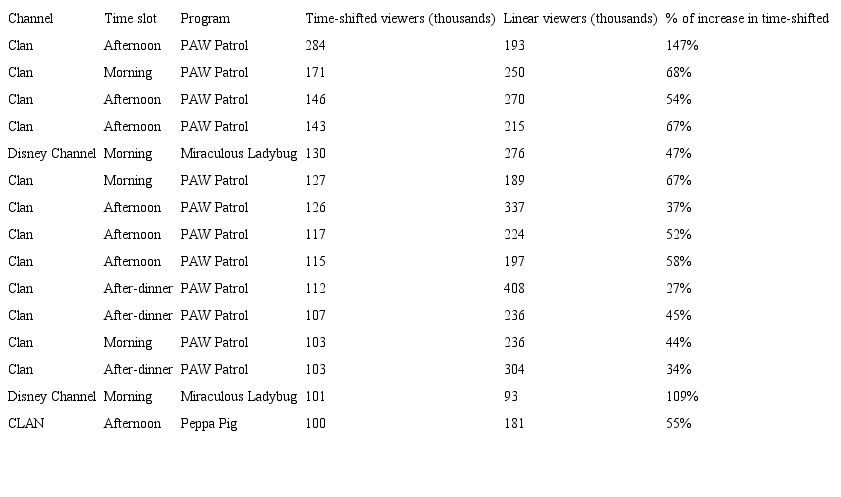 To better understand the phenomenon of the children’s programs with the highest time-shifted viewership it is necessary to observe the following table.