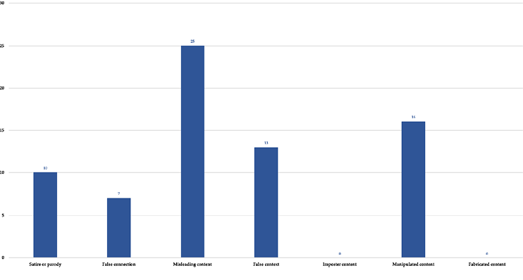 The main results obtained from this study are representative of the study universe of N = 71 hoaxes analyzed in Maldito Feminismo. In no case should these results be interpreted as values to be extrapolated to other fake news. Therefore, and considering the internal validity of this study, a significant number of hoaxes with misleading content (35.2%) related to feminism were detected, such as one attributing the statement “family is the defeat of women” to former Health Minister Carmen Montón (PSOE). As shown in Graph 1, manipulated content was also identified to a lesser extent (22.5%) -stating that the bridge that collapsed in Florida was built only by women. In terms of false context (18.3%) -the hoax consists of a video where a man appears explaining that the female victims of gender violence represent “less than 5%” in Madrid-; satirical information (14.1%) -such as one that affirms that Saudi scientists said that women are mammals, but not human- and hoaxes with a false connection (9.9%) - like the hoax where a photo of the Court for Gender Violence was used, where a safety net was installed, to claim that it prevents those arrested for gender-based violence from jumping off the window. Of the cases analyzed, no news was identified with impostor or fabricated content.