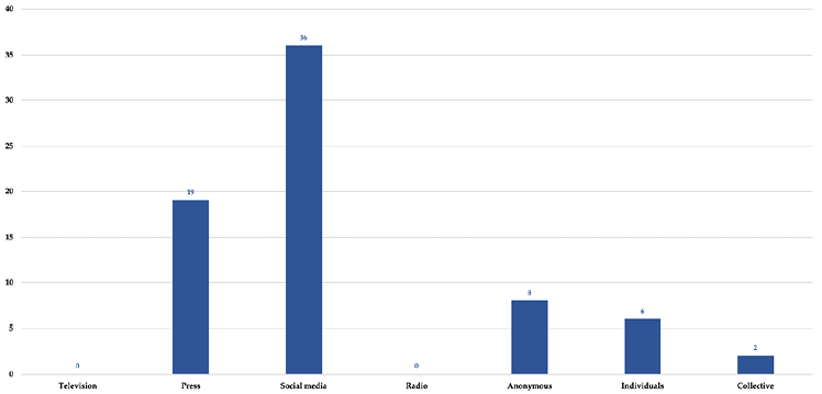 Source: Prepared by the authors.In relation to the agent who created or distributed the hoax, it was found that social media was the most prominent agent (50.7%) -like Putin’s video, in which he allegedly spoke about feminism, which went viral in Facebook-, followed, by a wide margin, by the press (26.8%) - such as the hoax published by the newspaper Mediterráneo digital, where it warned that “feminazis guarrindongas” [slutty feminazis] were going to simulate an abortion in a church in Valladolid. Anonymous broadcasters were also present in the sample (11.3%) - such as one that included some alleged statements by Marie Curie, in which she purportedly said: “I have never believed that because I am a woman I should have special treatment”. Private examples (8.4%) - such as the statements by the President of the Professional Association of Criminologists of Spain, Carlos Cuadrado, where he affirmed, without evidence, that 67 minors had been murdered by their mothers. This figure was later collected and disseminated by Fernando Sánchez Dragó, in his article in El Mundo newspaper. Finally, groups (2.8%) –like the hoax about a seminar of flat-earthers, from the feminist perspective, allegedly organized by a school of gender studies at the National University of Costa Rica. Moreover, as can be seen in Graph 2, no hoaxes created or distributed by television or radio were detected.