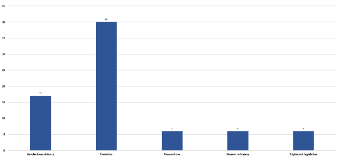 Source: Prepared by the authors.In Graph 3, it can be seen that the topic feminisms1 (56.4%) is the most representative in the hoaxes, although messages about gender-based violence2 have also been recorded (24%); including prominent figures in society3 (8.4%); also rights, norms or laws that affect women4 (8.4%); and news that seek to defame or damage the figure of famous women in history5 (2.8%).