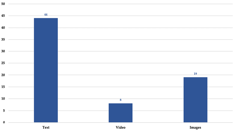 Source: Prepared by the authors.Text6 (62%) it is the most common format of hoaxes covered in Maldito Feminismo. Images7 (26.7%) and video8 (11.3%) have also been identified, but, as can be seen in Graph 4, these are less common formats in hoaxes related to feminism.
