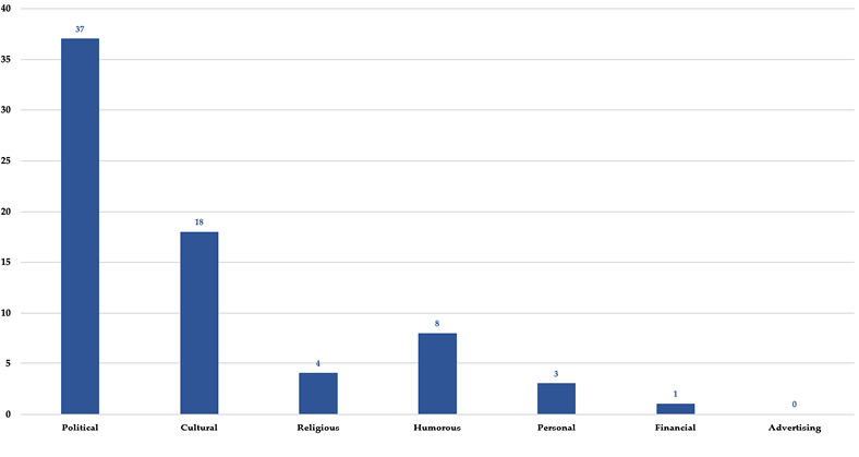 Source: Prepared by the authors.Graph 5 shows that, in 52.1% of the cases analyzed, the hoax has a political or ideological9 purpose, like the one who claims that feminists are going to force women to stop waxing. It is also worth noting that 25.4% of false news have a cultural purpose10, that is, that they want to cause harm or defame a person or group due to their social class, lifestyle, traditions, ethnicity, knowledge, etc. An example of this is the hoax stating a woman has named her son ‘Vagina’ to fight gender stereotypes. Although less common, hoaxes related to feminism also displayed a humorous objective11 (11.3%) -like one that was spread from a fake profile acting as a supposed feminist, who said that “tampax are a product designed by oppressive men”. Religious12 (5.6%) -such as the one that claims that a priest offers to perform exorcisms on feminists. Personal13 (4.2%) -such as the hoax about Vladimir Putin’s speech where, supposedly, he speaks of gender ideology. Finally, economic14 (1.4%) -like one that affirms that the Government has allocated 630 million euros to help the development of feminist and LGTBI.