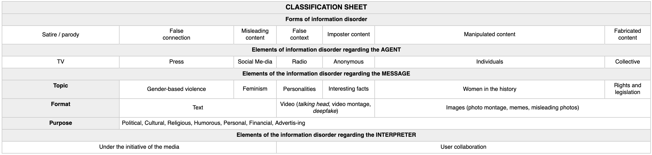 The units, categories and subcategories, collected in the analysis sheet, were defined in the code book and are inspired by the taxonomies of Derakhshan & Wardle (2017), Tandoc, Lim & Ling (2018) and Molina, Sundar, Le & Lee (2019), as well as recognized and endorsed by the scientific community for their precision and flexibility. These authors refer to “fake news” as an information disorder with different formal characteristics and intentions.