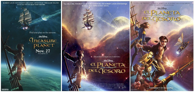 Treasure Planet is a revival of a classic Robert Stevenson story, but using a space age re-interpretation. In the poster we see a mix of elements of pirate adventure and space travel. However, the lettering is designed using uncial calligraphy, closer to manual carolingian lettering than an imaginary future world. The Spanish version respects the original typography. A horizontal line highlights the central element in both versions.