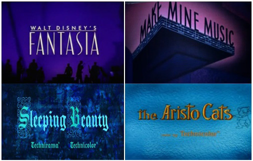 Main titles: Fantasia (Disney, 1940), Make Mine Music! (Disney, 1946), Sleepy Beauty (Disney, 1959) and The Aristocats (Hibler & Reitherman, 1970).