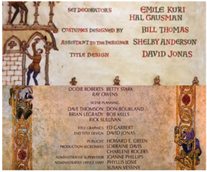 In the 1980s more information began to appear about the professionals involved in the film production process. Credits acknowledge the participation of David Jonas in the Design Titles of Bedknobs and Broomsticks and The Black Cauldron, in the latter together with Ed Garbet. These two examples incorporate the use of a Medieval-style backdrop and other touches. In Bedknobs and Broomsticks, all the information is presented again in the closing titles following the film’s final scene. However, in The Black Cauldron the title of the film is presented in the main titles and all the information about professionals and companies involved in the production of the film appears in the end credits, a scheme which is also used in the remainder of the films.